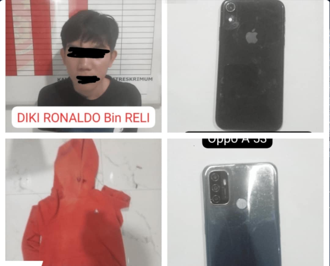 Barang bukti yang berhasil diamankan antara lain satu unit iPhone XR milik korban, pakaian yang digunakan tersangka saat beraksi berupa jaket hoodie warna oranye dan celana training hitam bergaris putih, serta satu unit handphone milik tersangka.