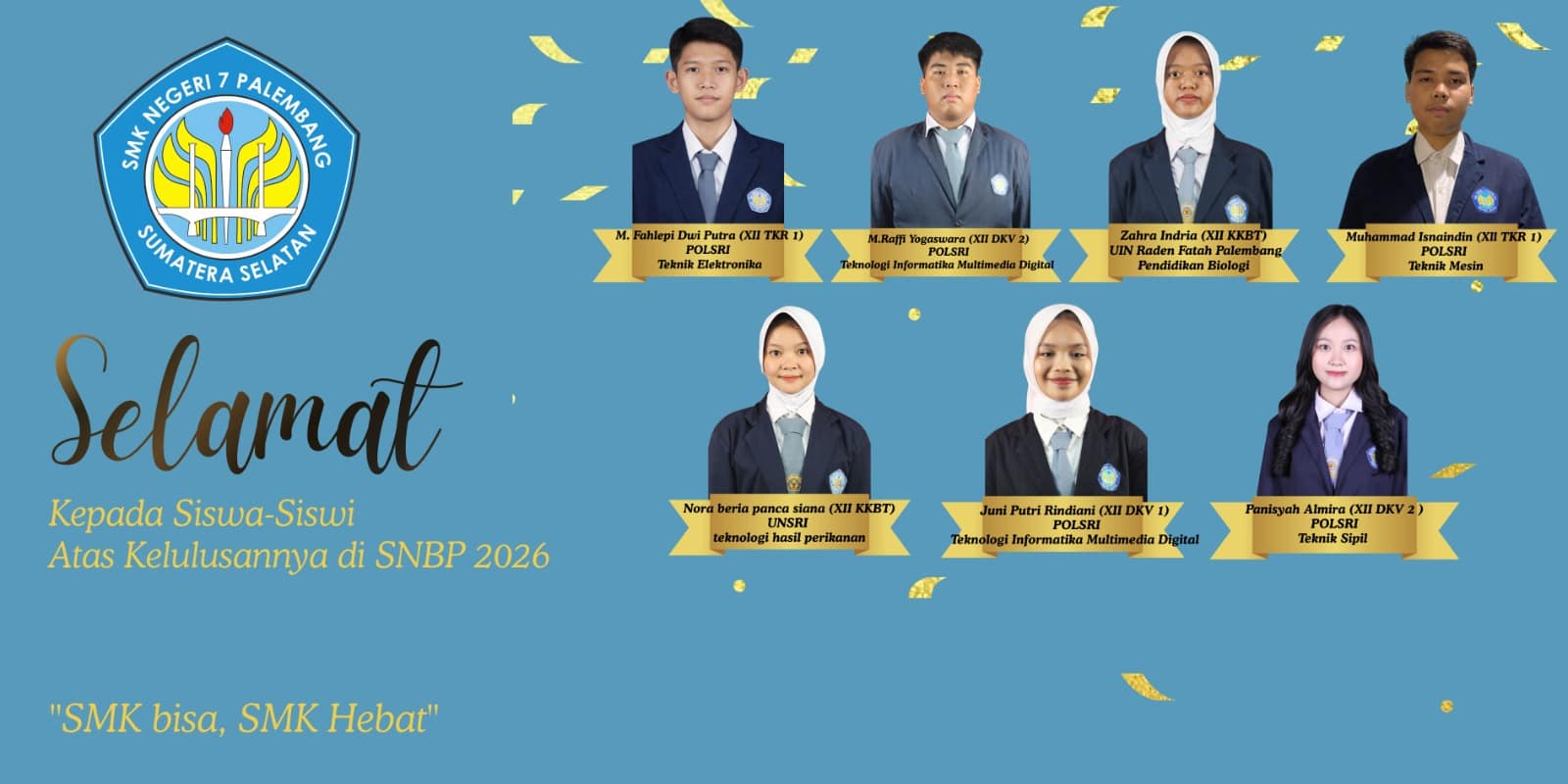 PALEMBANG** – Suasana haru dan bangga menyelimuti SMK Negeri 7 Palembang setelah pengumuman Seleksi Nasional Berdasarkan Prestasi (SNBP) 2026 resmi dirilis. Sebanyak tujuh siswa terbaik dari berbagai kompetensi keahlian berhasil memastikan kursi di perguruan tinggi negeri (PTN) ternama.