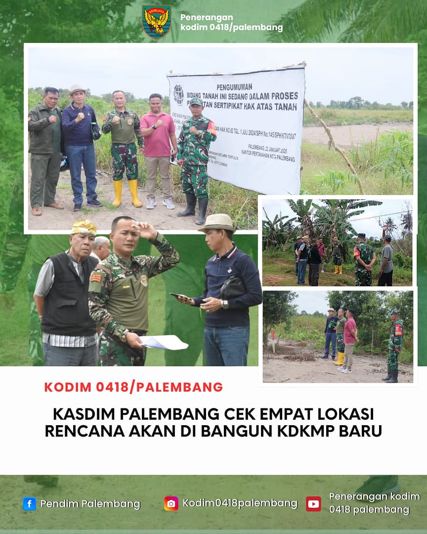 PALEMBANG – Komitmen TNI AD dalam mempercepat realisasi program pemberdayaan ekonomi masyarakat di Kota Palembang terus diperkuat. Komandan Kodim (Dandim) 0418/Palembang, Letkol Arh Erik Novianto, S.Sos., melalui Kepala Staf Kodim (Kasdim) Letkol Inf Dery Septriandi, S.T., M.M., M.Han., melakukan peninjauan langsung ke sejumlah titik bakal lahan Koperasi Desa/Kelurahan Merah Putih (KDKMP), pada [Masukkan Hari/Tanggal].