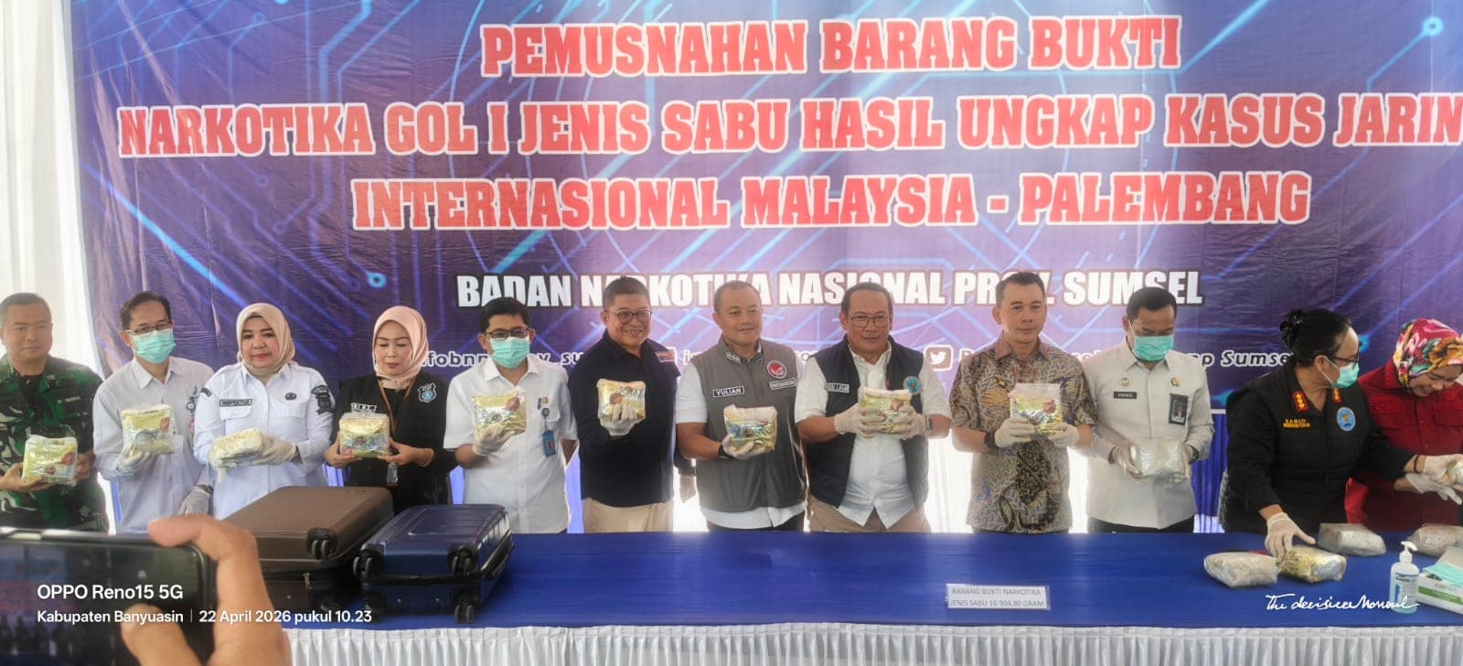 PALEMBANG – Badan Narkotika Nasional Provinsi (BNNP) Sumatera Selatan kembali menunjukkan komitmennya dalam memerangi peredaran gelap narkotika dengan memusnahkan barang bukti sabu seberat 16,9 kilogram. Barang haram golongan I tersebut merupakan hasil pengungkapan jaringan narkotika internasional yang diduga berasal dari Malaysia dan masuk melalui jalur distribusi ke Palembang.
