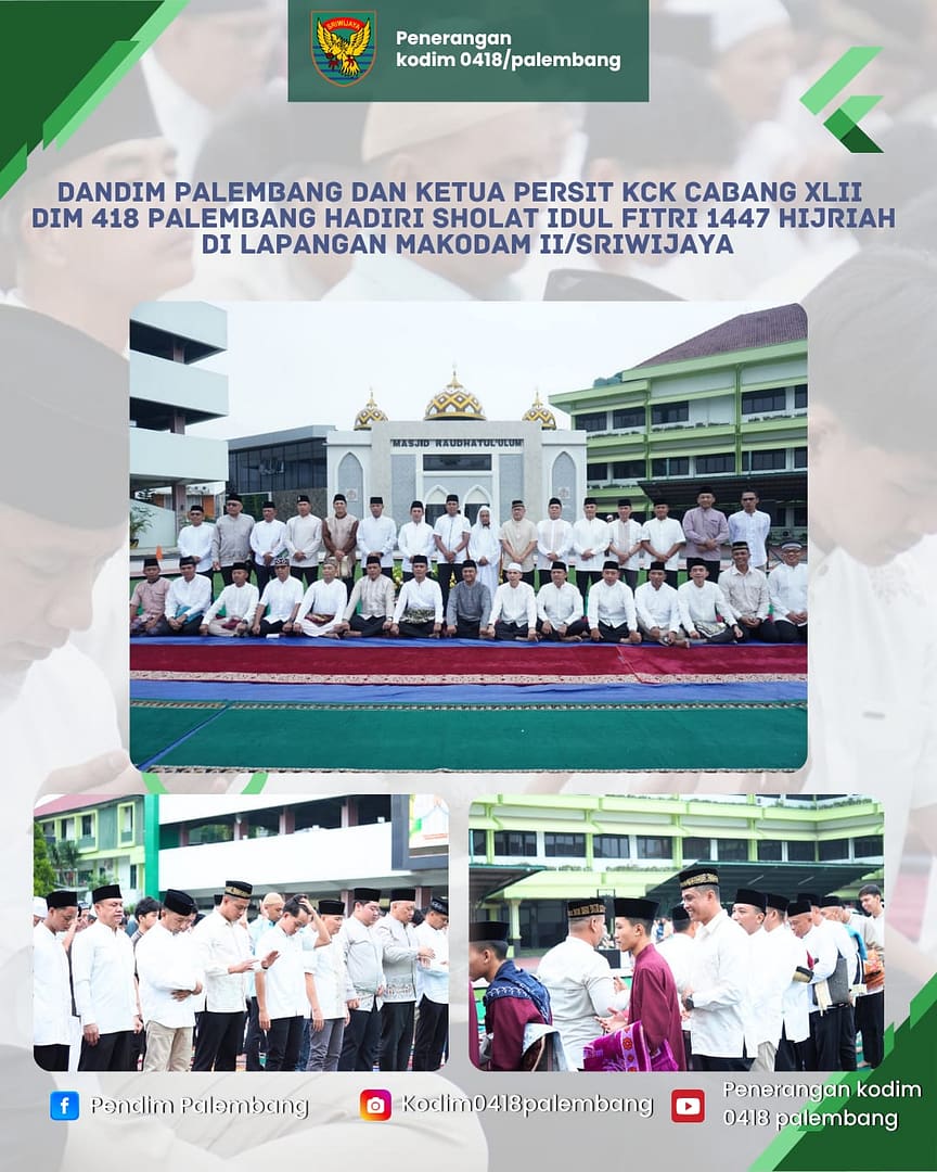 PALEMBANG – Komandan Kodim 0418/Palembang Letkol Arh Erik Novianto,S.Sos bersama Ketua Persit Kartika Chandra Kirana (KCK) Cabang XLII Dim Palembang menghadiri pelaksanaan Sholat Idul Fitri 1447 Hijriah di Lapangan Makodam II/Sriwijaya, Sabtu (21/3/2026).