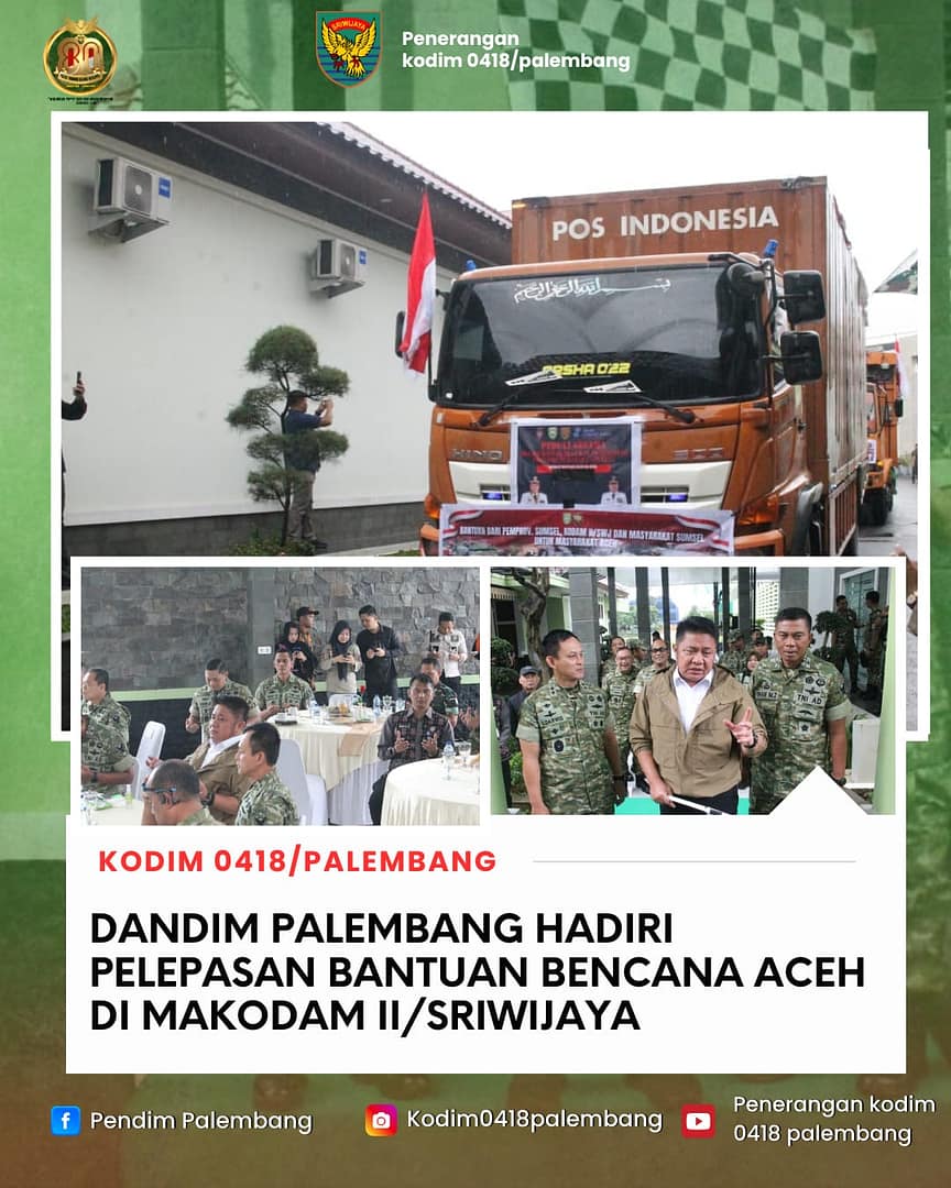 PALEMBANG –  Komandan Kodim (Dandim) 0418/Palembang Letkol Arh Erik Novianto, S.Sos. menghadiri kegiatan pelepasan bantuan logistik kemanusiaan bagi masyarakat yang terdampak bencana hidrometeorologi di wilayah Sumatera, bertempat di Makodam II/Sriwijaya, Palembang, Jumat (9/1/2026).