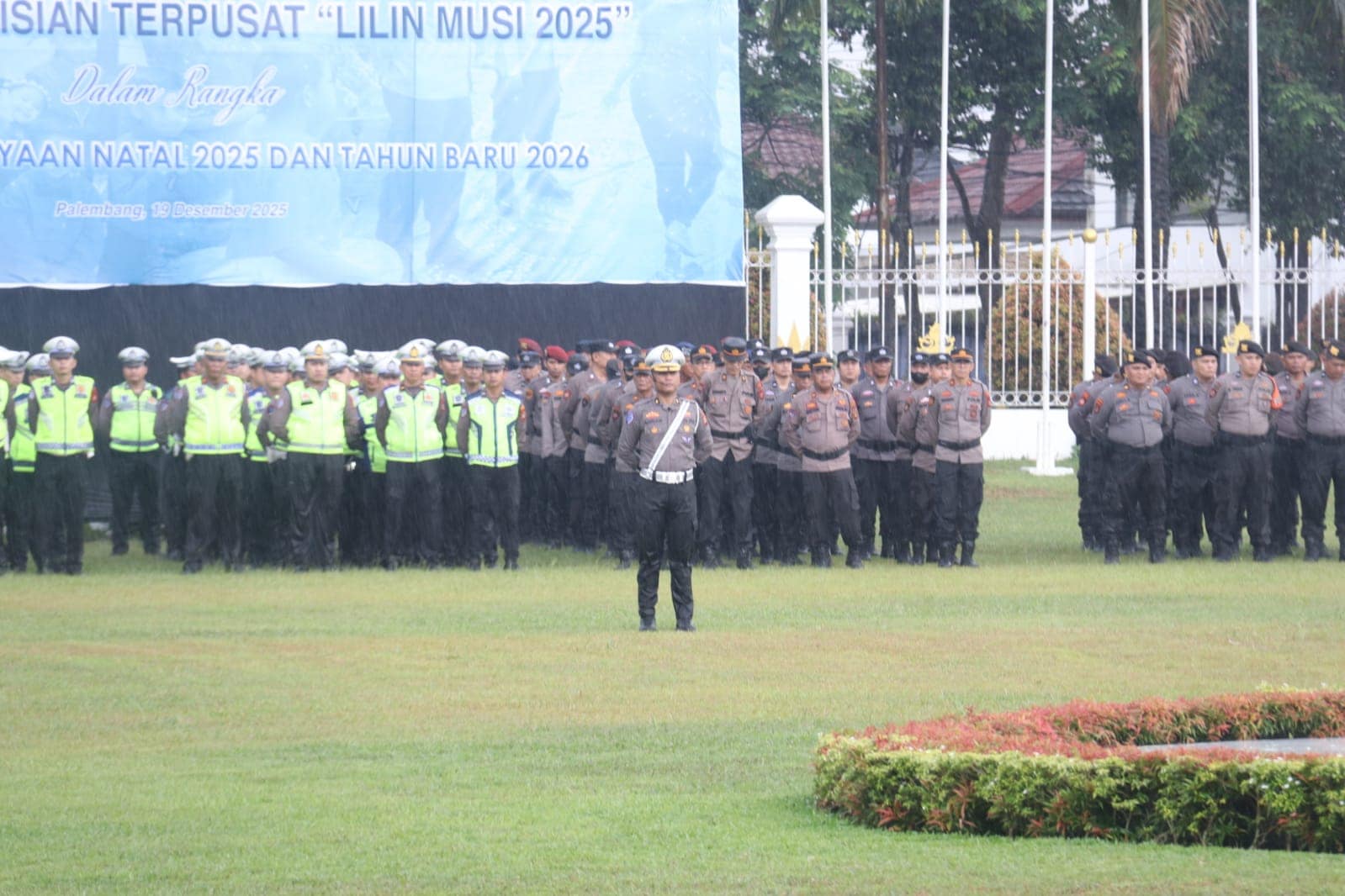 PALEMBANG – Kepolisian Daerah Sumatera Selatan (Polda Sumsel) bersama Pemerintah Provinsi Sumatera Selatan menggelar Apel Gelar Pasukan Operasi Lilin Musi 2025 di halaman Griya Agung Palembang, Jumat (19/12/2025). Meski diguyur hujan lebat sejak awal kegiatan, apel tetap berlangsung dengan tertib dan khidmat sebagai wujud kesiapan serta dedikasi aparat dalam mengamankan perayaan Natal 2025 dan Tahun Baru 2026.