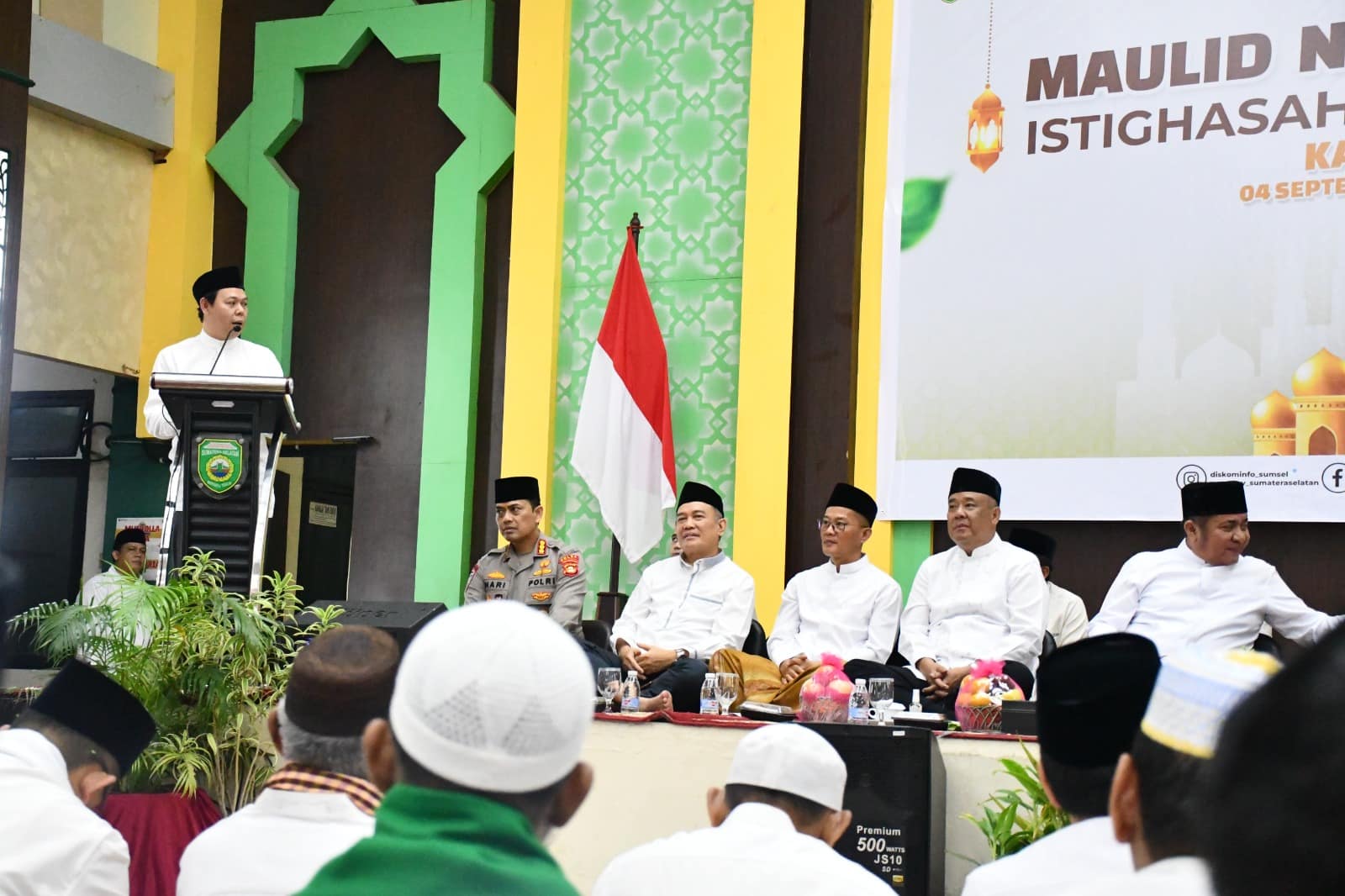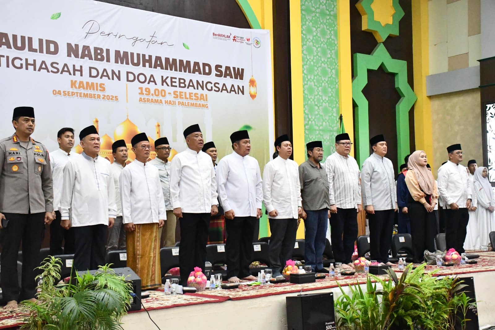 Kanwil Kemenag Sumsel bekerjasama dengan Pemprov Sumsel menggelar kegiatan peringatan Maulid Nabi Muhammad SAW, Istighasah, dan Doa Kebangsaan di Gedung Serbaguna Asrama Haji Sumsel, Kamis (04/09/2025) malam. Kegiatan ini dihadiri Ketua DPD RI Sultan Baktiar Najamudin, Gubernur Sumsel H. Herman Deru, Duta Besar Negara Republik Seychelles Nico Barito, Wakil Ketua DPD RI Yorrys Raweyai, Anggota DPD RI Jialyka Maharani, Wakil Gubernur Sumsel H. Cik Ujang, Sekjen DPD RI Komjen Polisi M. Iqbal, Forkopimda Sumsel, Kakanwil Kemenag Sumsel H. Syafitri Irwan, Kabag TU, Kepala Bidang, dan Pembimas Kanwil Kemenag Sumsel, Kakankemenag Kota Palembang, Banyuasin, dan Ogan Ilir, Kepala BDK Palembang H. Saefudin, ASN Kemenag Sumsel, para pemimpin majelis agama, pemimpin ormas, serta massa lintas agama.