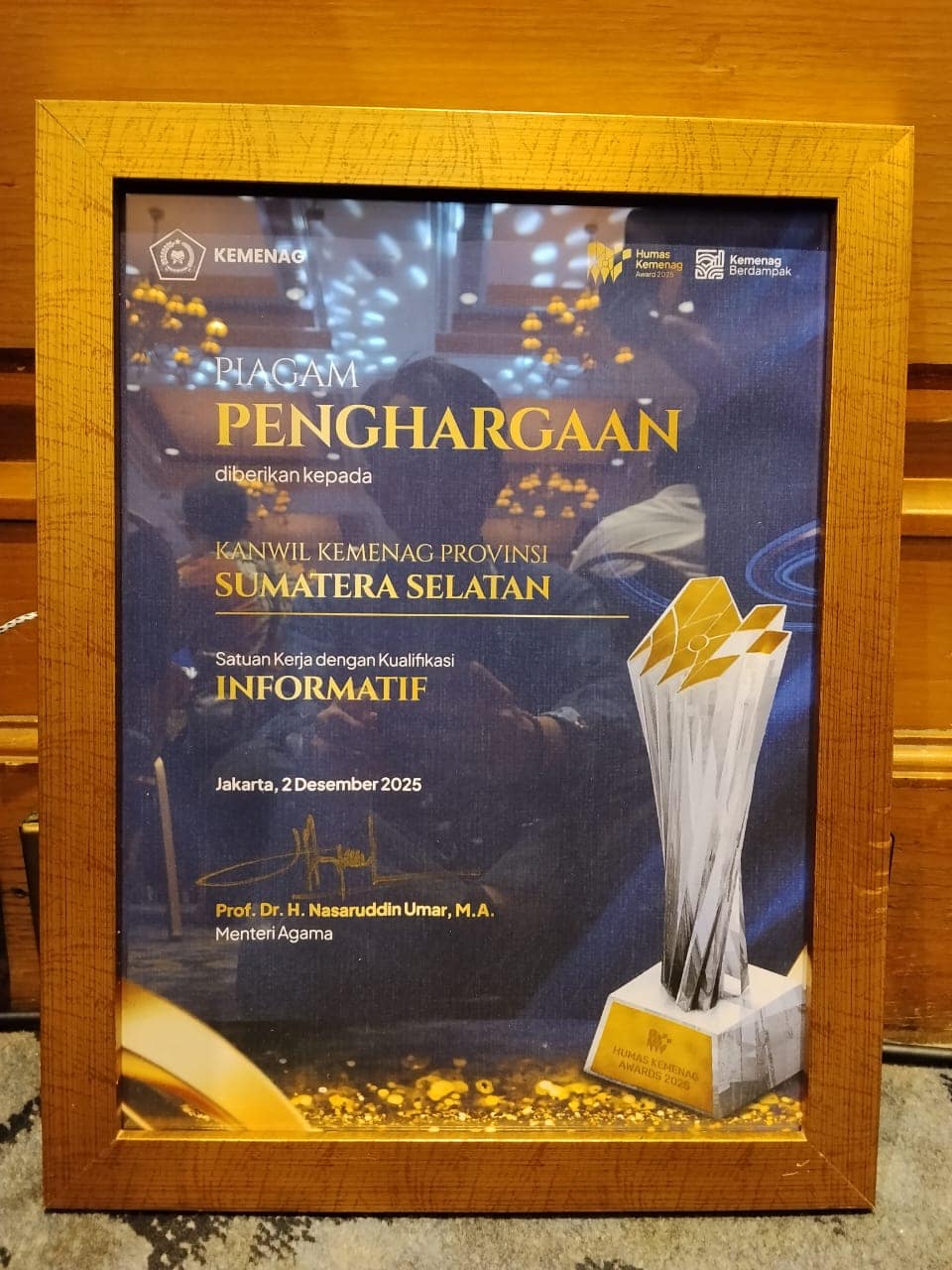 Kanwil Kemenag Sumsel kembali meraih prestasi membanggakan di level nasional. Kali ini dengan meraih tiga penghargaan pada ajang Humas Kemenag Award 2025 yang digelar Biro Humas dan Komunikasi Publik Setjen Kemenag RI di Hotel Aryaduta Menteng, Jakarta, Senin (01/12/2025) malam.