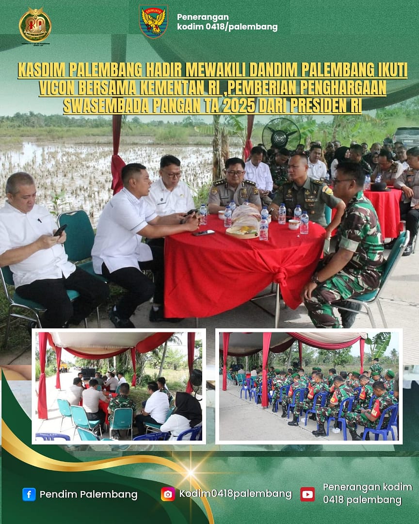 Palembang – Kepala Staf Kodim (Kasdim) 0418/Palembang Letkol Inf Dery Septriandi, S.T., M.M., M.Han, menghadiri kegiatan Panen Raya Nasional dan Pengumuman Swasembada Pangan Tahun Anggaran 2025 yang diselenggarakan oleh Kementerian Pertanian Republik Indonesia secara virtual (Video Conference/Vicon), Rabu (7/1/2026).