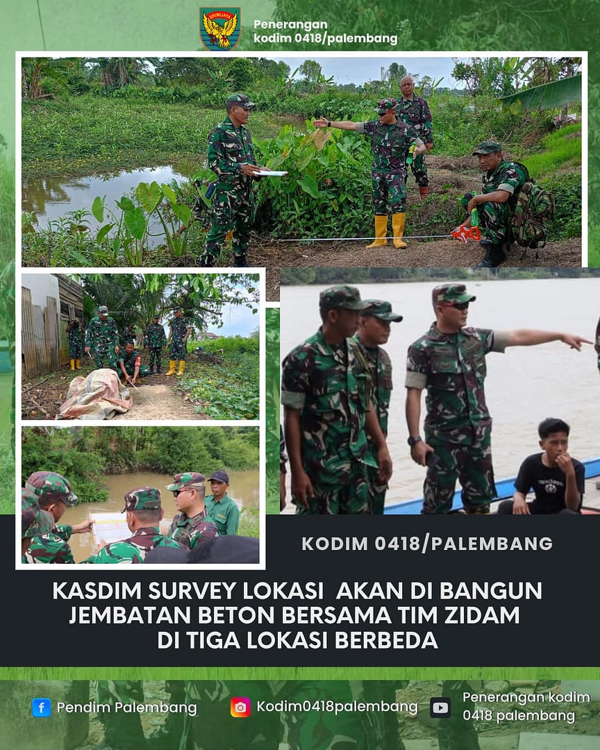 PALEMBANG – Kasdim 0418/Palembang Letkol Inf Dery Septriandi, S.T., M.M., M.Han yang mewakili Dandim melaksanakan survey tiga lokasi rencana pembangunan jembatan beton bersama tim Zeni Kodam (Zidam II/Swj) di wilayah Kecamatan Gandus, Palembang.