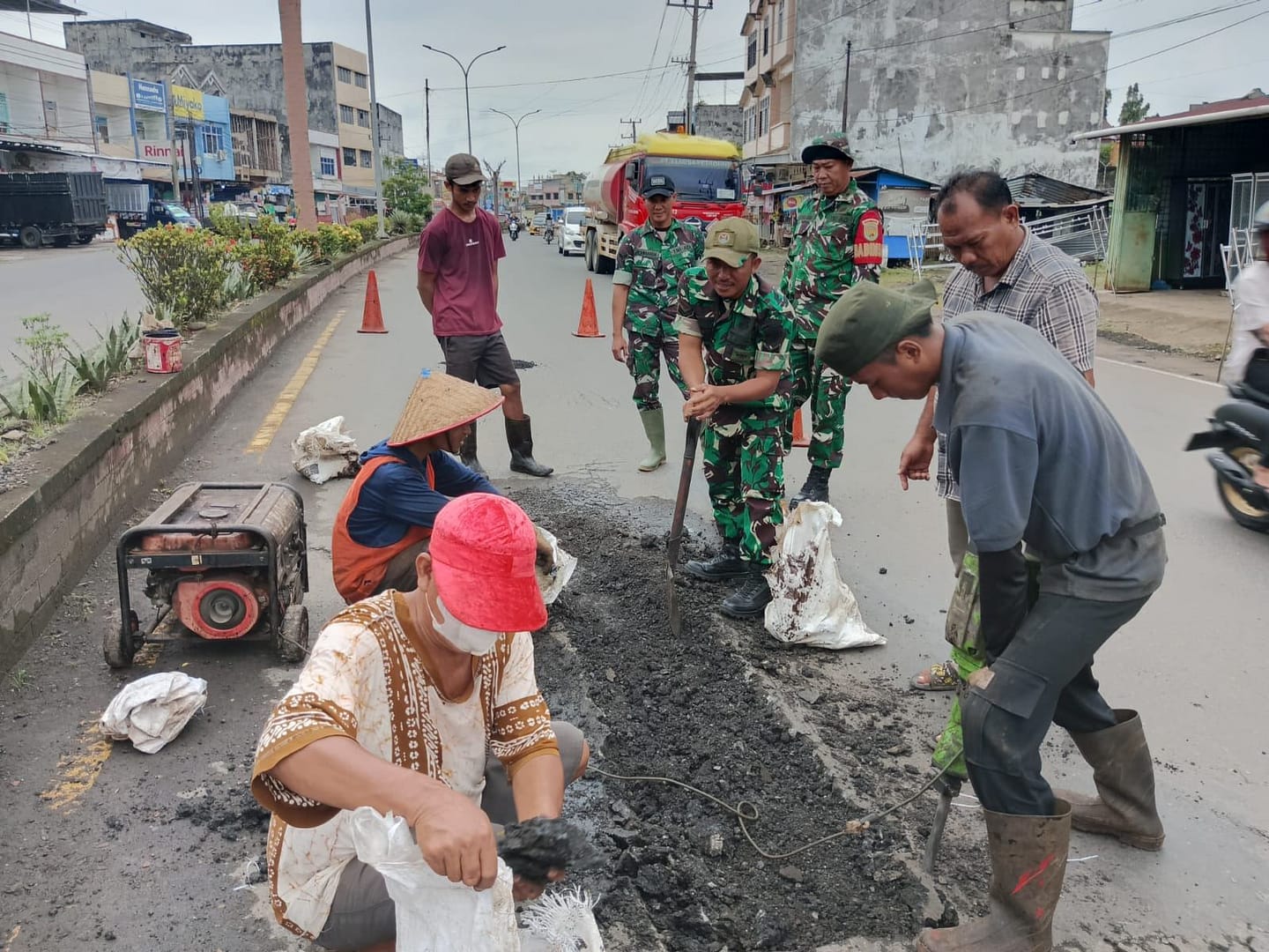 Palembang – Dalam rangka mendukung kelancaran arus mudik menjelang Hari Raya Idul Fitri, Korem 044/Gapo melaksanakan kegiatan karya bakti berupa penambalan jalan-jalan yang berlubang di sejumlah titik wilayah Sumatera Selatan.