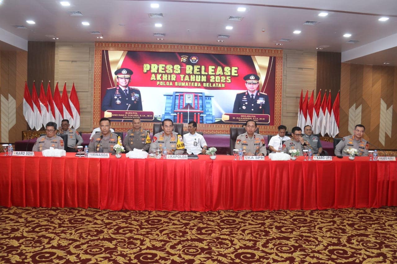 PALEMBANG – Kepolisian Daerah Sumatera Selatan (Polda Sumsel) menggelar rilis akhir tahun 2025 untuk memaparkan capaian kinerja sekaligus evaluasi situasi keamanan dan ketertiban masyarakat (kamtibmas) selama satu tahun terakhir. Kegiatan tersebut dipimpin langsung Kapolda Sumsel, Irjen Pol Andi Rian R. Djajadi, S.I.K., M.H., sebagai wujud akuntabilitas publik dan transparansi institusi kepolisian.