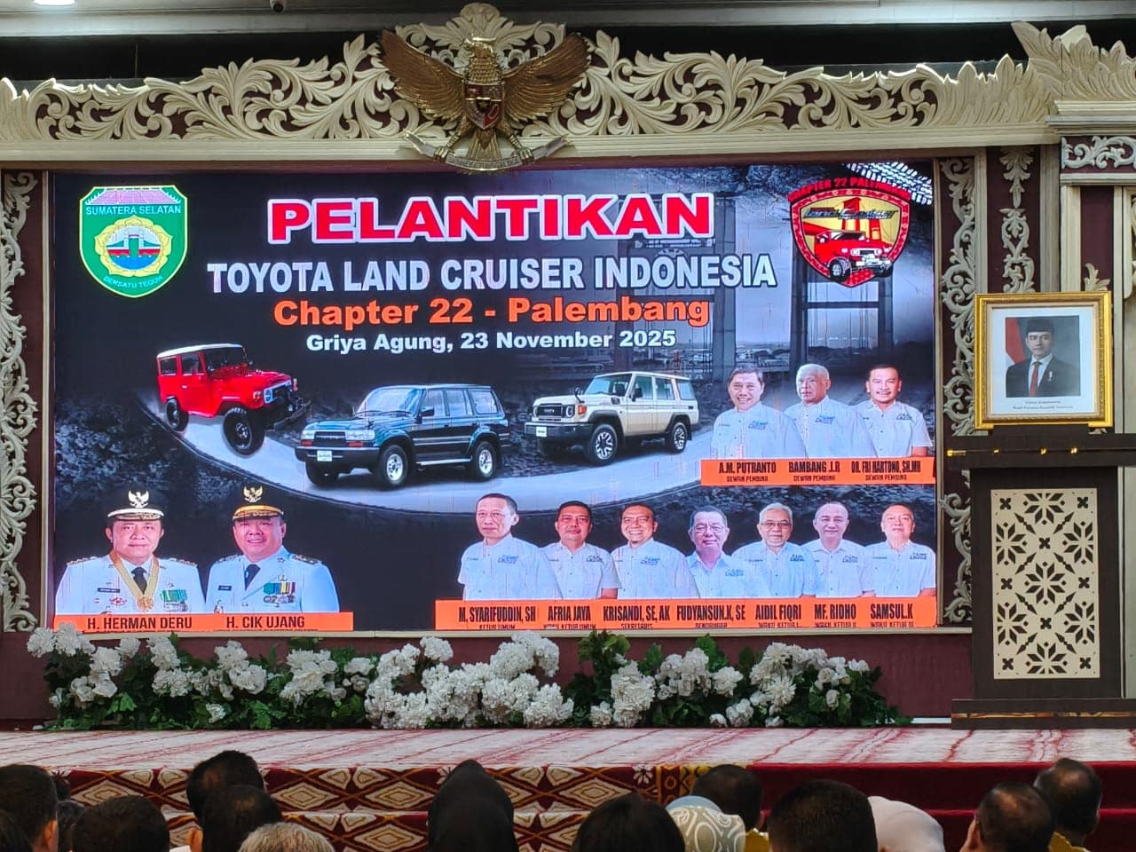 PALEMBANG — Kepengurusan Toyota Land Cruiser Indonesia (TLCI) Chapter 22 Palembang periode 2025–2028 resmi dilantik dalam sebuah acara penuh keakraban di Griya Agung Palembang, Minggu malam (23/11/2025). Prosesi pelantikan dilakukan langsung oleh Gubernur Sumatera Selatan H. Herman Deru bersama Wakil Gubernur Sumsel H. Cik Ujang.