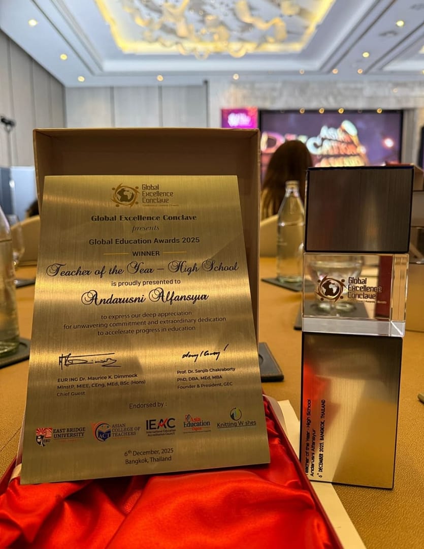 Global Education Award sendiri dikenal sebagai ajang apresiasi internasional bagi guru, lembaga pendidikan, serta inovator yang dinilai berkontribusi bagi kemajuan pendidikan dunia. Prestasi yang diraih Andarusni diharapkan menjadi pemantik semangat bagi para guru lainnya untuk terus berinovasi, memperkuat pendampingan, serta meningkatkan kualitas pembelajaran di sekolah maupun madrasah. (Firdaus)