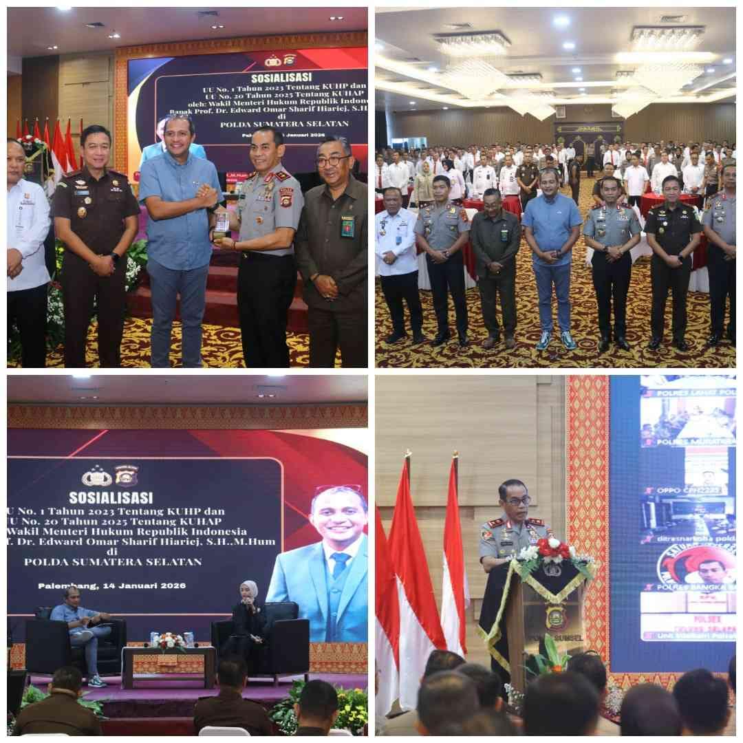 PALEMBANG – Kepolisian Daerah Sumatera Selatan (Polda Sumsel) menggelar kegiatan sosialisasi hukum terkait pemberlakuan Kitab Undang-Undang Hukum Pidana (KUHP) dan Kitab Undang-Undang Hukum Acara Pidana (KUHAP) terbaru. Kegiatan yang menghadirkan Wakil Menteri Hukum RI, Prof. Dr. Edward Omar Sharif Hiariej, S.H., M.Hum., ini berlangsung di Auditorium Gedung Presisi Mapolda Sumsel, Rabu (14/1/2026).