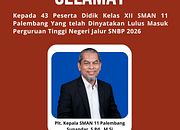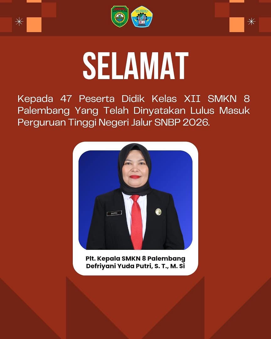 Palembang – Prestasi membanggakan kembali diukir oleh putra-putri terbaik SMK Negeri 8 Palembang. Berdasarkan pengumuman resmi Seleksi Nasional Berdasarkan Prestasi (SNBP) Tahun 2026, sebanyak 47 siswa-siswi Kelas XII dari berbagai program keahlian dinyatakan lulus dan diterima di berbagai Perguruan Tinggi Negeri (PTN) bergengsi di Indonesia. Keberhasilan ini menjadi bukti kualitas pendidikan di SMKN 8 Palembang dan semangat belajar yang tinggi dari para siswanya.