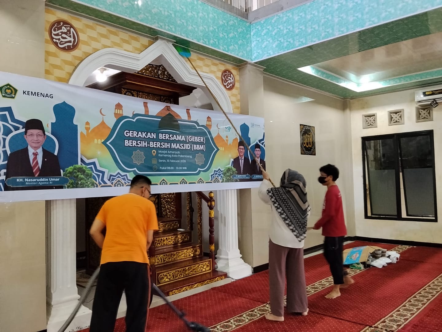 Palembang (Kemenag Sumsel) — Semangat menyambut bulan suci Ramadan 1447 H mulai terasa di Sumatera Selatan. Kepala Kantor Wilayah Kementerian Agama Provinsi Sumatera Selatan, Syafitri Irwan, memimpin langsung Gerakan Bersama Bersih-Bersih Masjid (Geber BBM) yang dipusatkan di Masjid Azhariyah, Jalan Jenderal Ahmad Yani, 14 Ulu, Seberang Ulu II, Palembang, pada Senin pagi (16/02/2026).