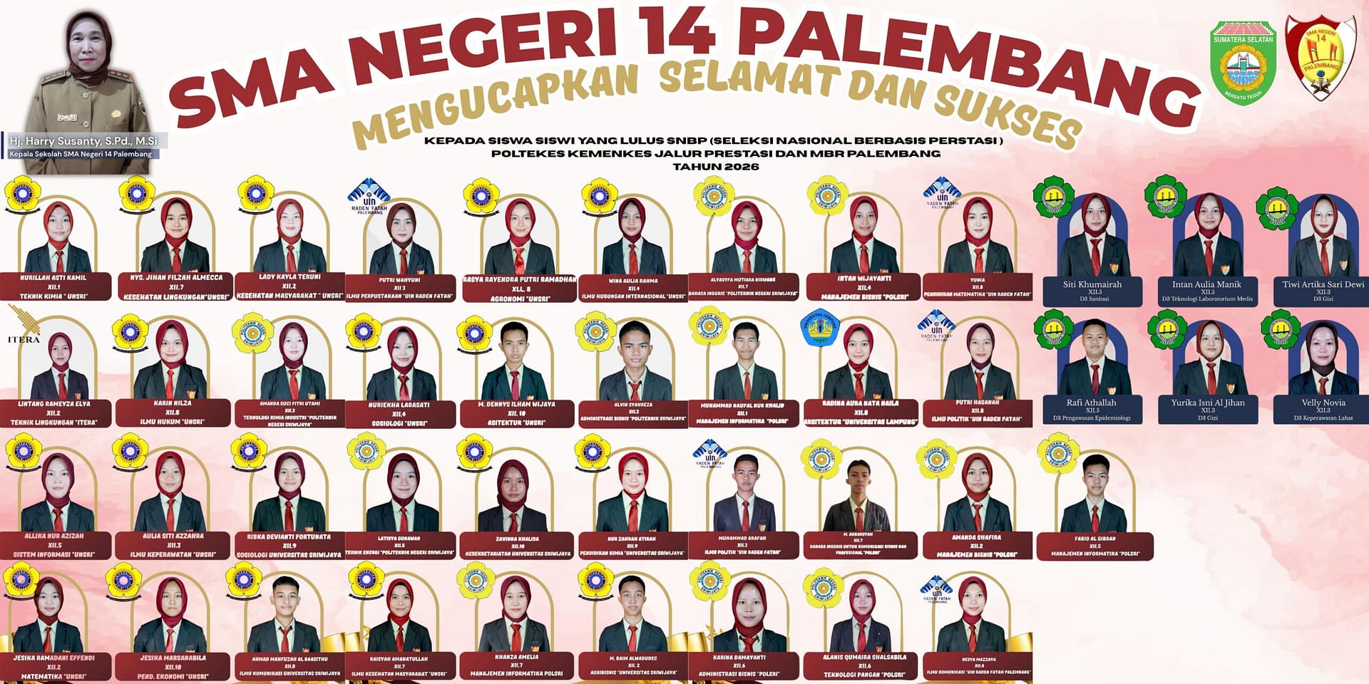 ​PALEMBANG – Kabar membanggakan datang dari keluarga besar SMA Negeri 14 Palembang. Sebanyak puluhan siswa-siswi terbaiknya dinyatakan lulus dalam Seleksi Nasional Berbasis Prestasi (SNBP) serta Jalur Prestasi dan MBR Poltekkes Kemenkes Palembang tahun akademik 2026.