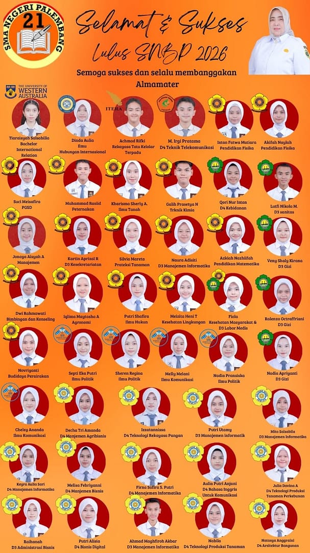 Kelulusan tahun ini menunjukkan keragaman minat dan bakat siswa SMAN 21 Palembang, dengan sebaran di berbagai universitas dan politeknik, antara lain: