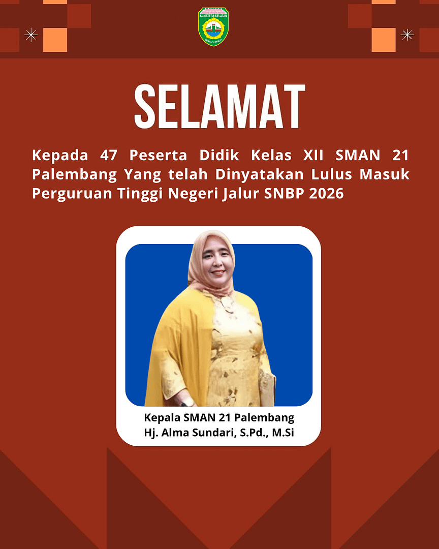 PALEMBANG – Keluarga besar SMA Negeri 21 Palembang tengah diselimuti rasa bangga. Sebanyak 47 siswa-siswinya dinyatakan lulus dalam Seleksi Nasional Berdasarkan Prestasi (SNBP) 2024. Prestasi ini menjadi bukti nyata kualitas pendidikan dan bimbingan yang diberikan sekolah dalam mengantarkan putra-putri terbaiknya ke jenjang pendidikan tinggi.