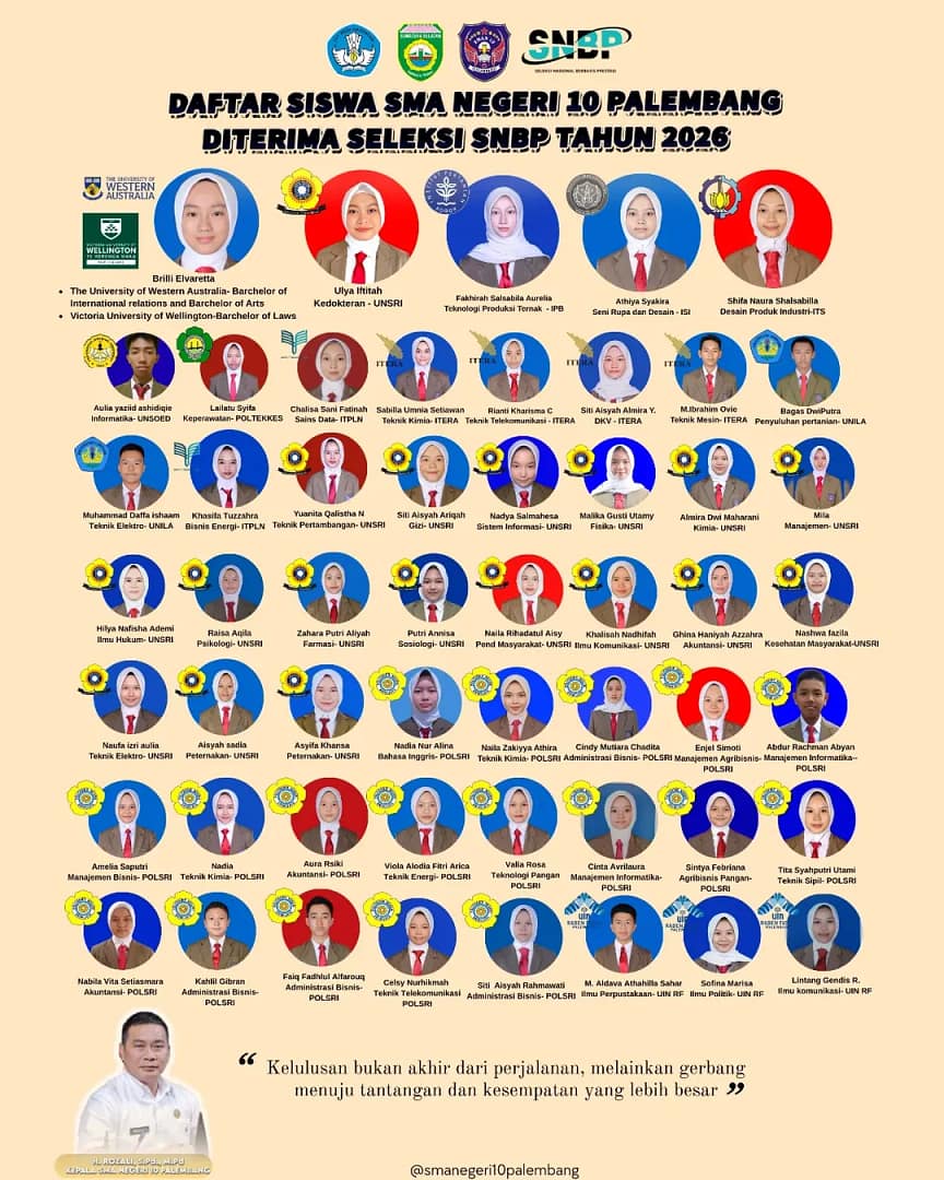 “Selamat atas kelulusan kalian! Jaga amanah ini dengan baik, segera lakukan daftar ulang, dan tetaplah rendah hati. Ingat, keberhasilan kalian juga membawa nama baik almamater SMAN 10 Palembang di perguruan tinggi tersebut,” tegasnya.